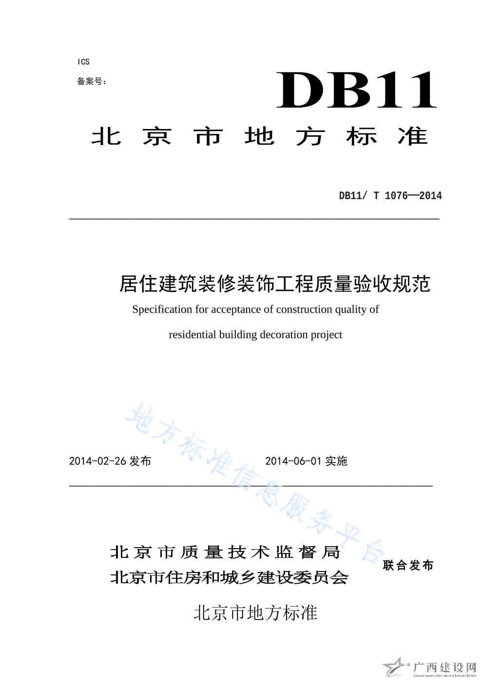 DB11 T_1076-2014居住建筑裝修裝飾工程質量驗收規范
