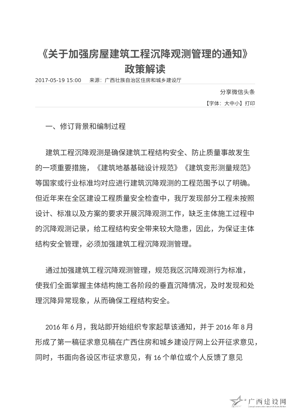 建筑工程沉降觀測是確保建筑工程結(jié)構(gòu)安全、防止質(zhì)量 事故發(fā)生的一項重要措施,《建筑地基基礎(chǔ)設(shè)計規(guī)范》《建 筑變形測量規(guī)范》等國家或行業(yè)標(biāo)準(zhǔn)均對應(yīng)進行建筑沉降觀 測的工程范圍予以了明確。但近年來在全區(qū)建設(shè)工程質(zhì)量安 全檢查中,我廳發(fā)現(xiàn)部分工程未按照設(shè)計、標(biāo)準(zhǔn)以及方案的 要求開展沉降觀測工作,缺乏主體施工.......