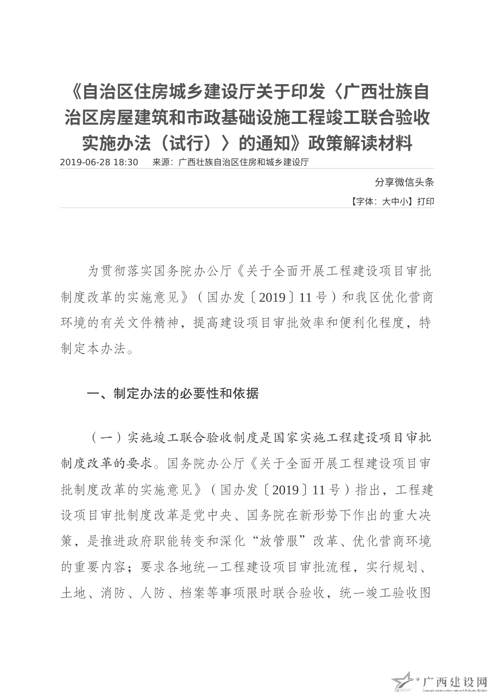 《廣西壯族自治區(qū)房屋建筑和市政基礎(chǔ)設(shè)施工程竣工聯(lián)合驗(yàn)收實(shí)施辦法(試行)》的通知