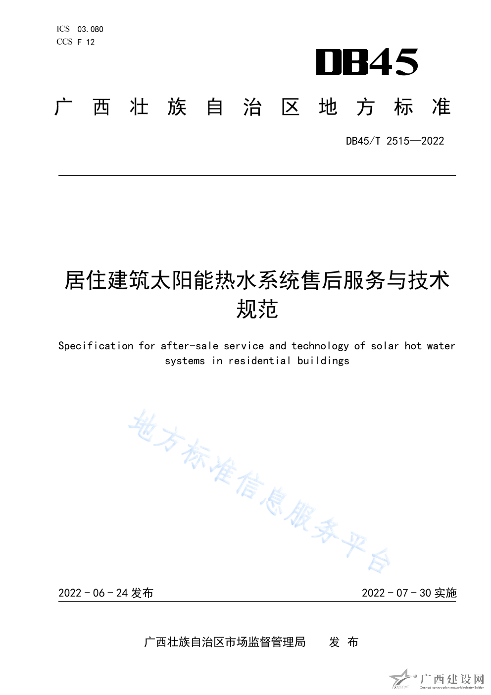 DB45T+2515-2022+居住建筑太陽能熱水系統售后服務與技術規范