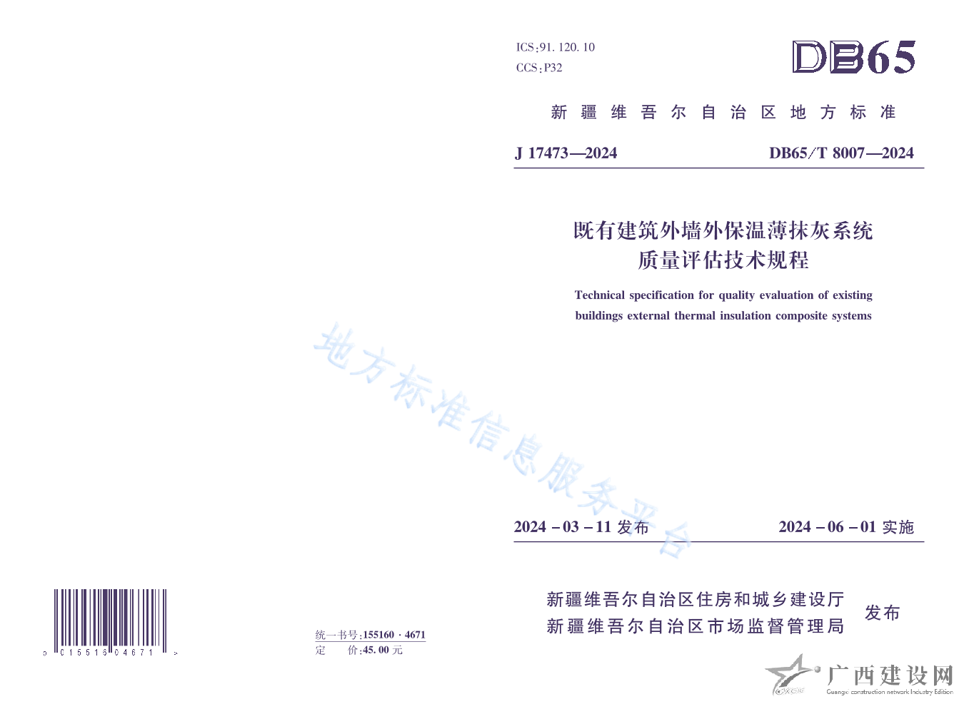 DB65T 8007-2024既有建筑外墻外保溫薄抹灰系統質量評估技術規程