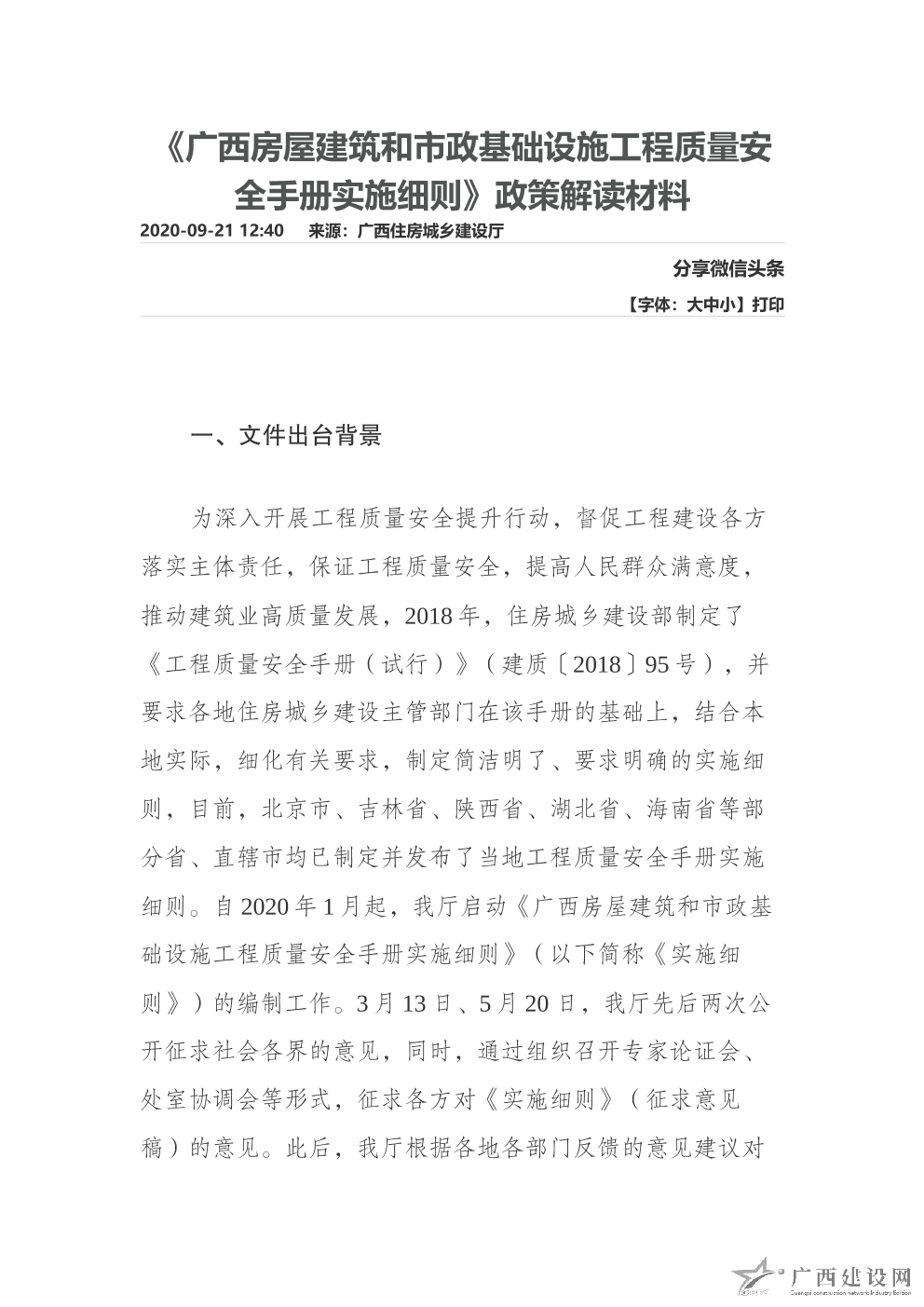 《廣西房屋建筑和市政基礎(chǔ)設(shè)施工程質(zhì)量安全手冊實(shí)施細(xì)則》政策解讀材料