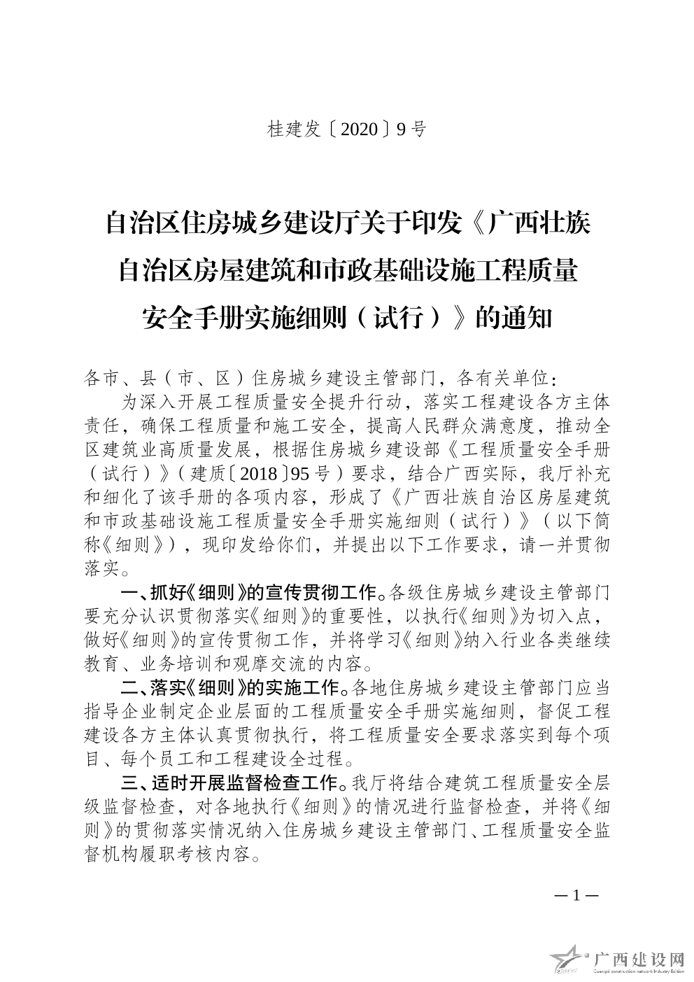 《廣西壯族自治區(qū)房屋建筑和市政基礎(chǔ)設(shè)施工程質(zhì)量安全手冊實(shí)施細(xì)則(試行)》的通知